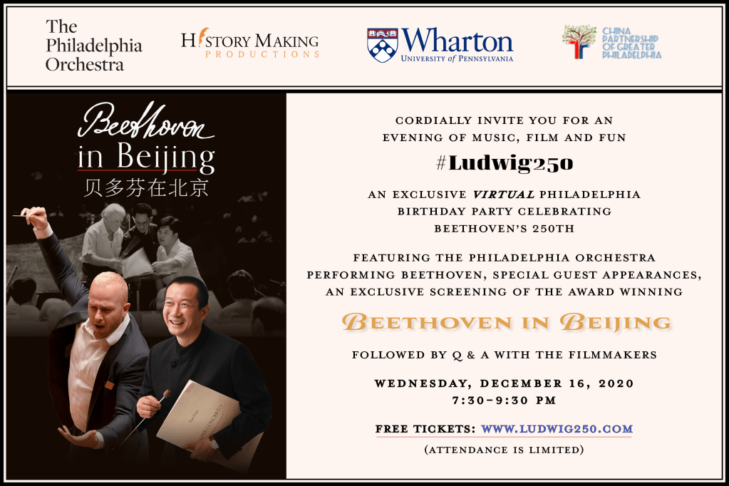 China Partnership of Greater Philadelphia cordially invites you to join as our guest a special, limited audience viewing of the film to celebrate Beethoven’s 250 birthday. The film will be followed by live-streamed and interactive Q&A session with the two co-producers and the filmmaker.